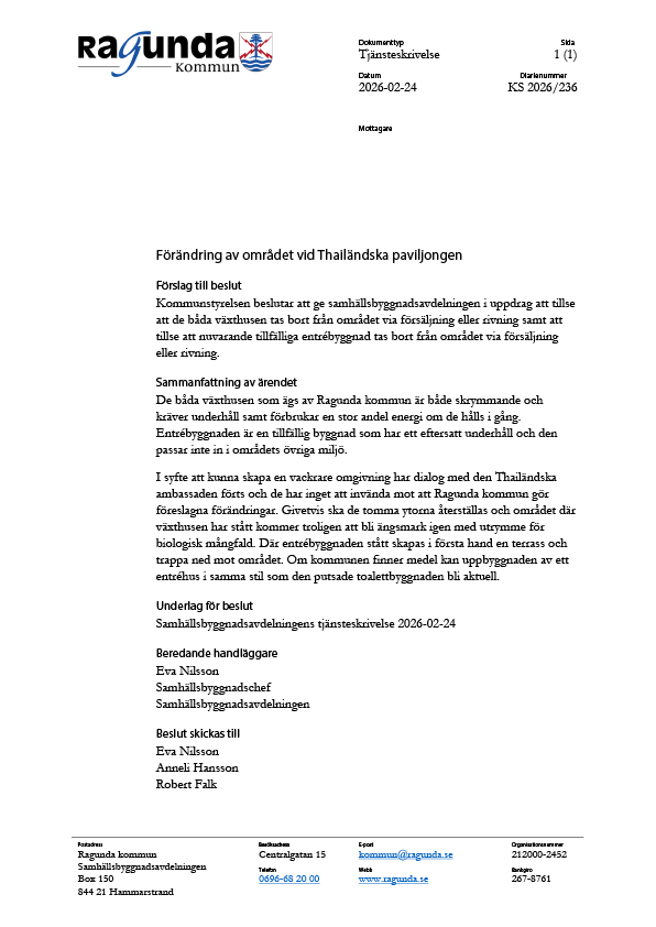 เทศบาลรากุนดา (Ragunda kommun) มีความประสงค์ที่จะดำเนินการปรับเปลี่ยนพื้นที่บริเวณศาลาไทยดังต่อไปนี้